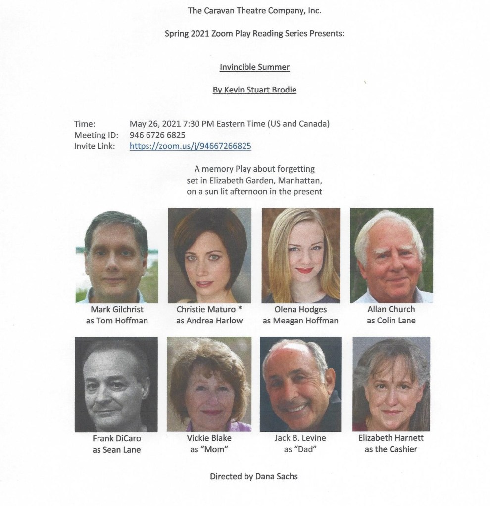 Don’t get me wrong: I was honored and excited to receive a call from theatre director/producer Dana Sachs. Dana said he had read my play, really liked it, and wanted to stage a reading using the actors from the Caravan Theatre Company of Cheshire, Connecticut to stage a reading on Zoom. He said he already had the actors in mind for the cast, and just needed my go ahead. The play had not been read by actors for nearly five years, and this was the first time there had been any activity about the play since my agent passed away last year from Covid-19. I enthusiastically said yes.